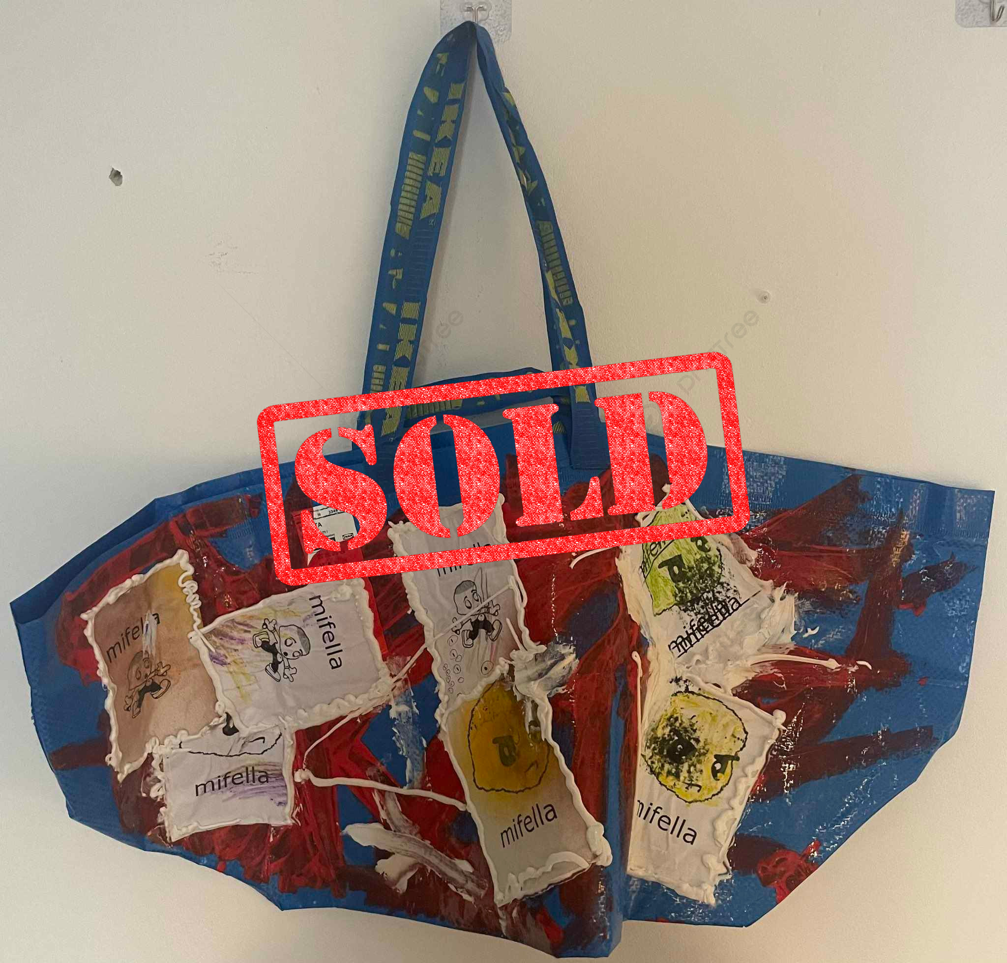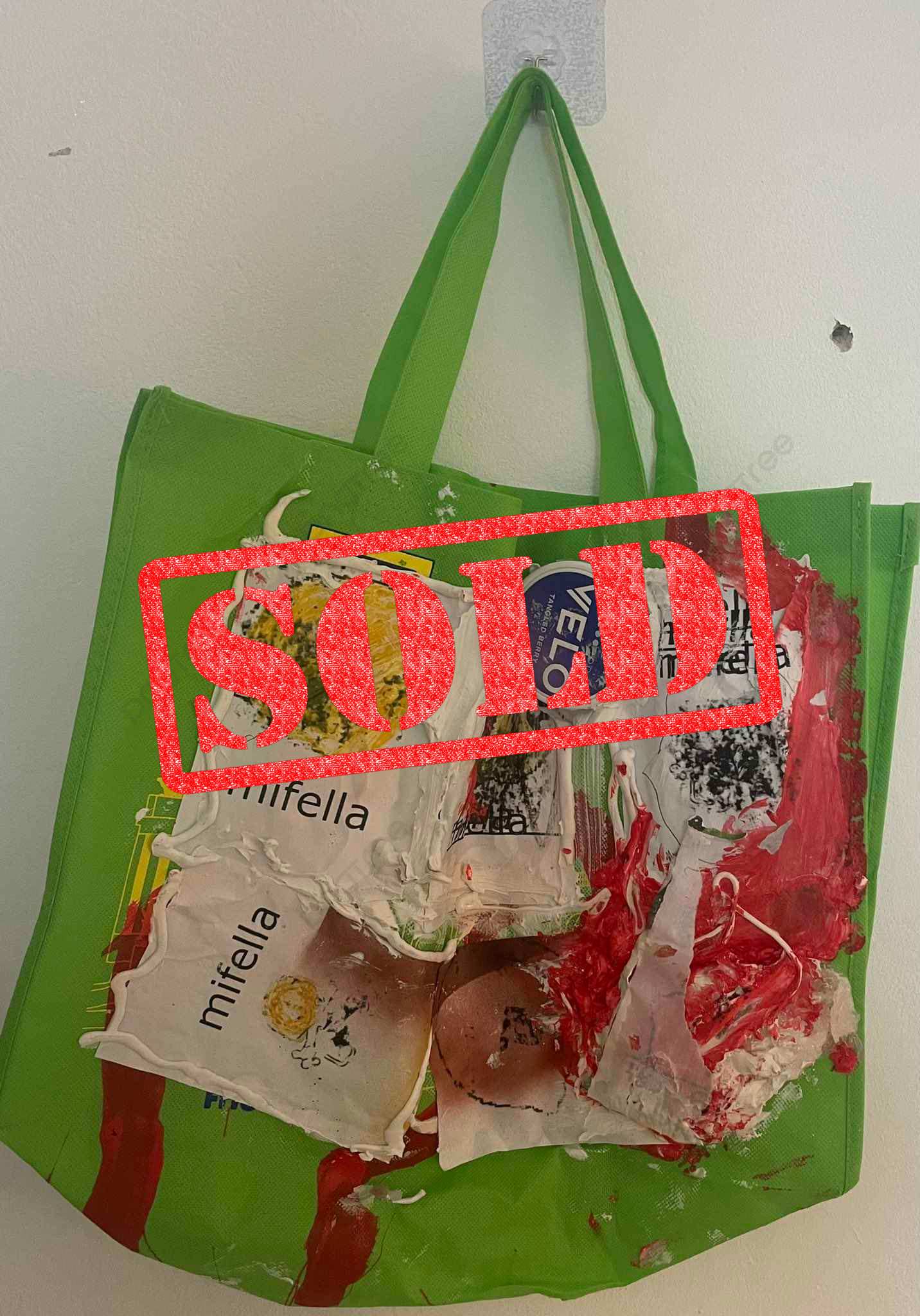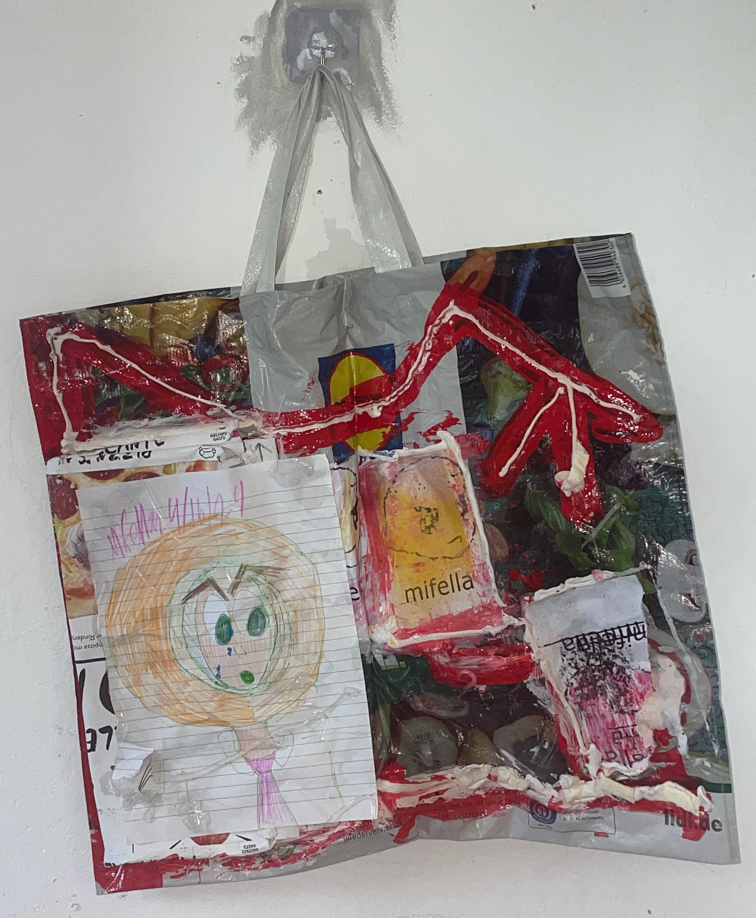 mixed materials on bag. 40 x 42 cm.